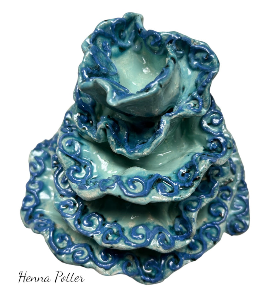 Hand-built ceramic coral sculpture art that can be a shelf / counter top decor . 6” wide x 6” tall. Slip-trailed textures on the surface when the clay was still drying. Fired to cone 04.