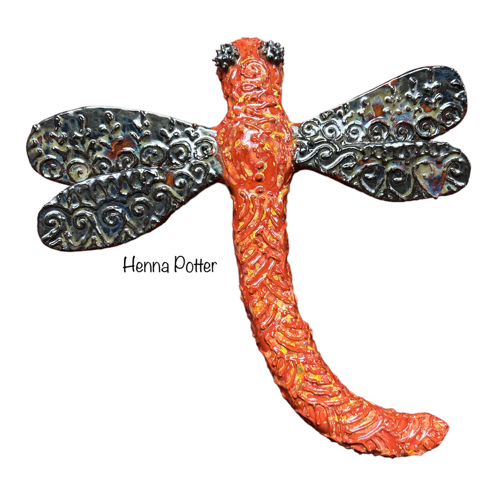 Hand-built dragonfly wall sculpture. 10” long x 9.5” wide. Slip trailed textures by piping clay free-hand on the dragonfly when the clay is still drying. The dragonfly was glazed with reddish orange for the body and moonlit mirror on the wings and eyes. Fired to cone 04. Ready to hang on the wall.
