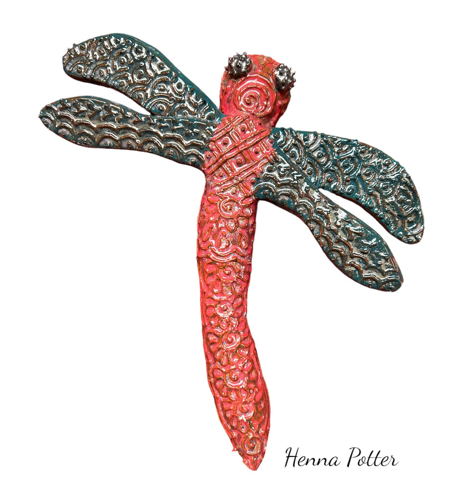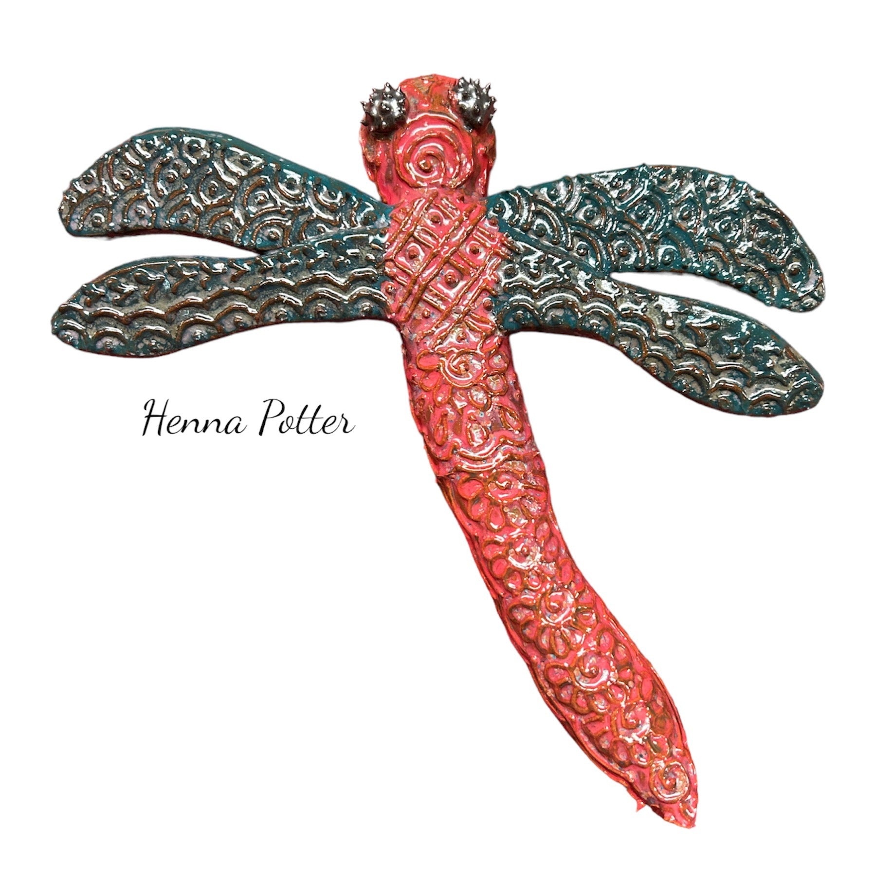 Hand-built dragonfly wall sculpture. 9.5” long x 9” wide. Slip trailed textures by piping clay free-hand on the dragonfly when the clay is still drying. The dragonfly was glazed with dark red for the body, teal on the wings and moonlight mirror on the eyes. Fired to cone 04. Ready to hang on the wall.