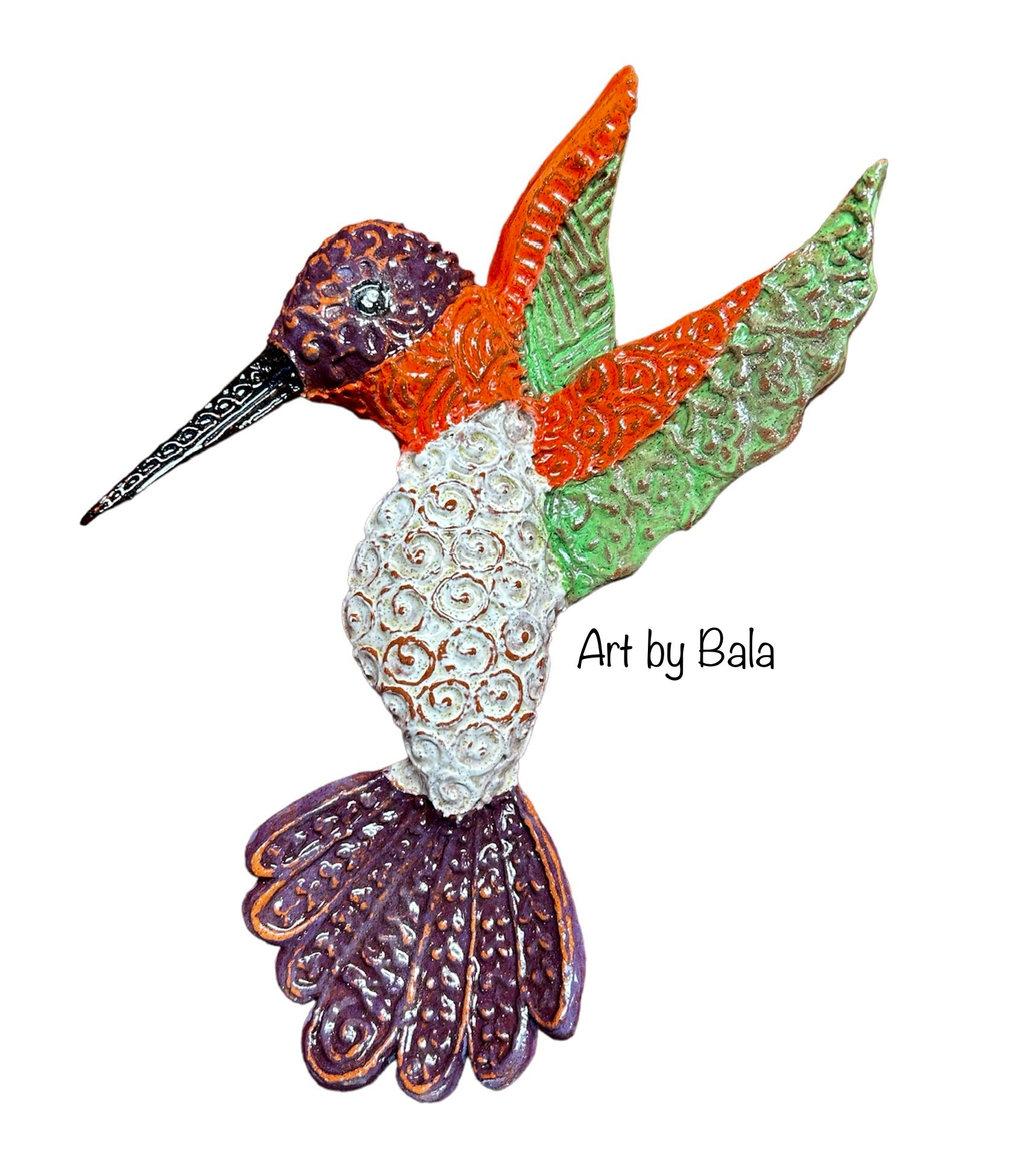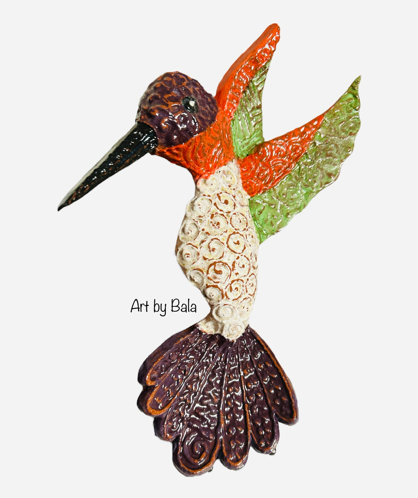 Hand-built hummingbird ceramic wall sculpture. 9” long x 8” wide. Slip trailed textures by piping clay free-hand on the hummingbird when the clay is still drying. The hummingbird was covered with underglaze for the various colors and a low fire glaze on top. Fired to cone 04. Wired in the back & ready to hang on the wall.