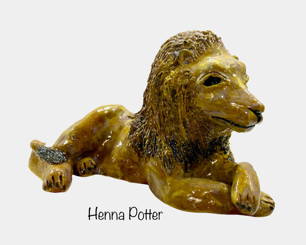 Hand-built Lion sculpture. ~ 8" x 4.5" x 4.5"”. Slip-trailed henna style textures on the mane. Painted with underglazes and finished with a clear glaze.