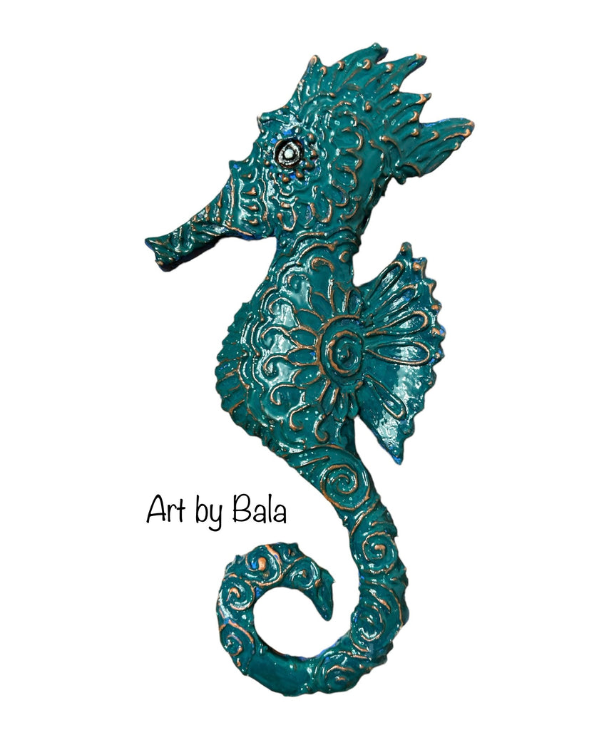 Hand-built sea horse ceramic wall sculpture. 9” long x 5” wide. Slip trailed textures by piping clay free-hand on the sea horse when the clay is still drying. The sea horse was covered with a blue underglaze and a low fire teal glaze on top. Fired to cone 04. Wired in the back & ready to hang on the wall.