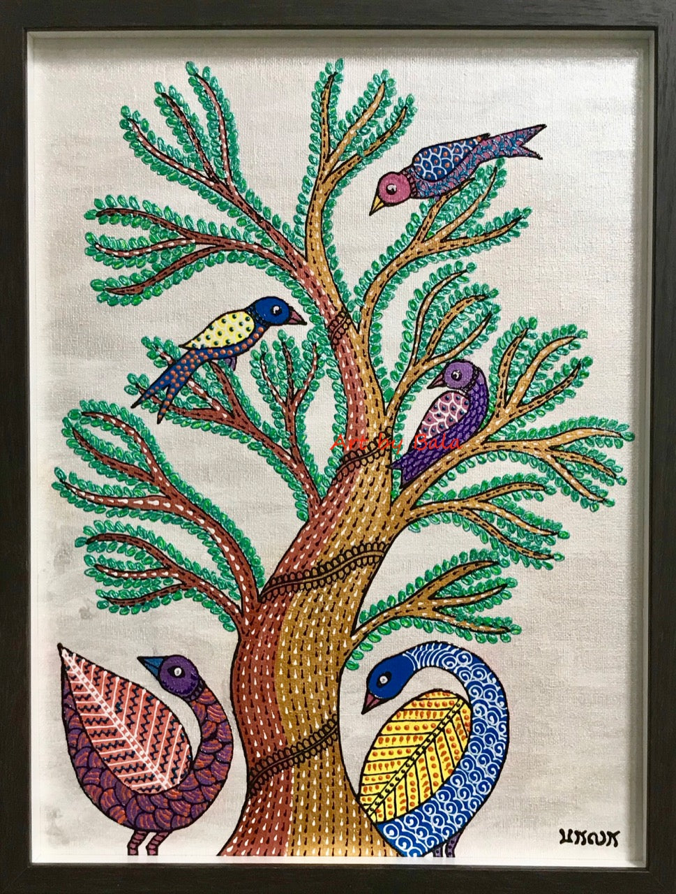 Textured henna-style acrylic Folk Art Painting on canvas panel in a frame.