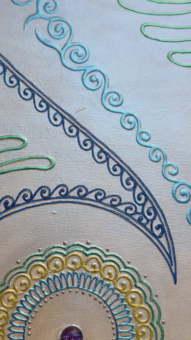 Textured henna-style acrylic Mandala Painting on canvas with dichroic glass & mirrors in the center.