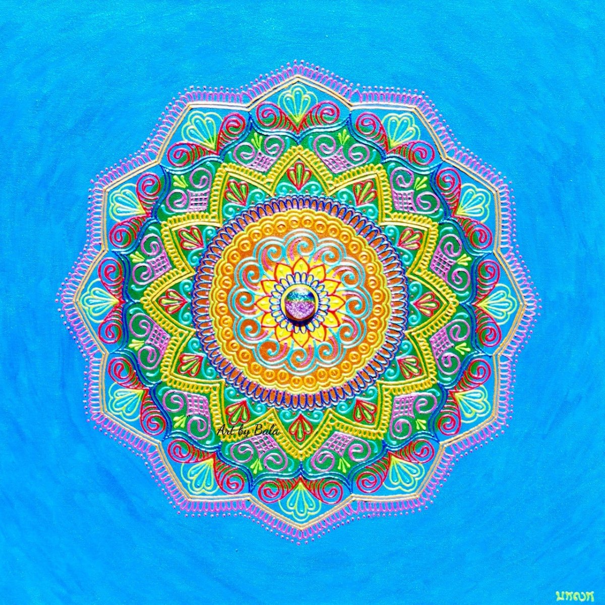 Textured henna-style acrylic Mandala Painting on canvas with dichroic glass in the center. Original One of a kind painting created with a unique technique.