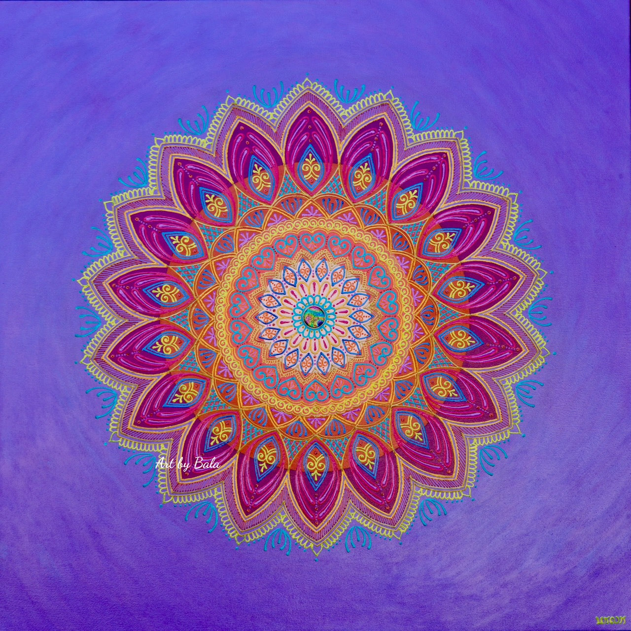 High Quality Photo reproduction of the henna style textured Euphoria Mandala Painting on metallic paper. Metallic paper has a unique surface that gives the artwork a metallic or iridescent look, adding depth and richness to the colors.