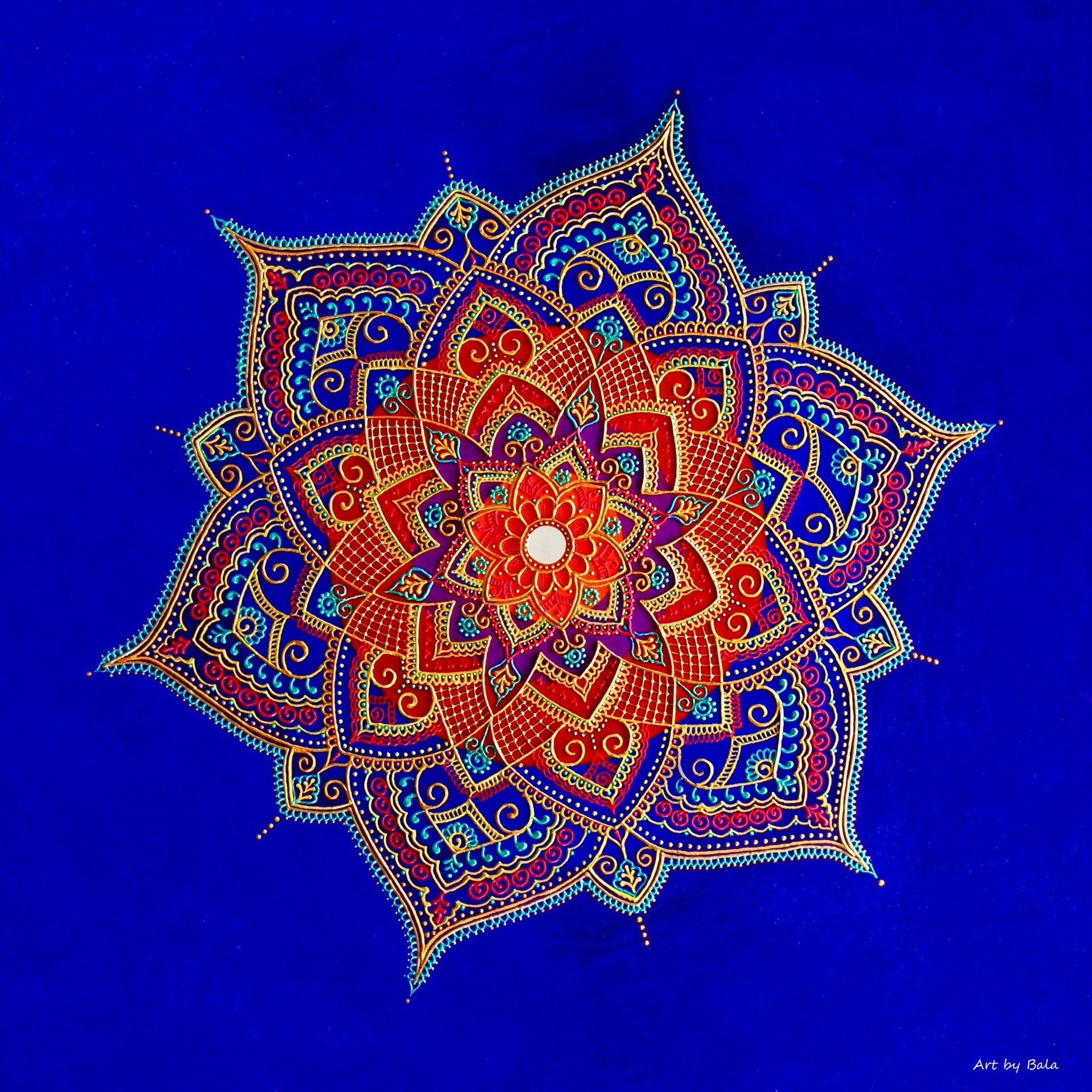 High Quality Photo reproduction of the henna style textured Vibrance Mandala Painting on metallic paper. Metallic paper has a unique surface that gives the artwork a metallic or iridescent look, adding depth and richness to the colors.