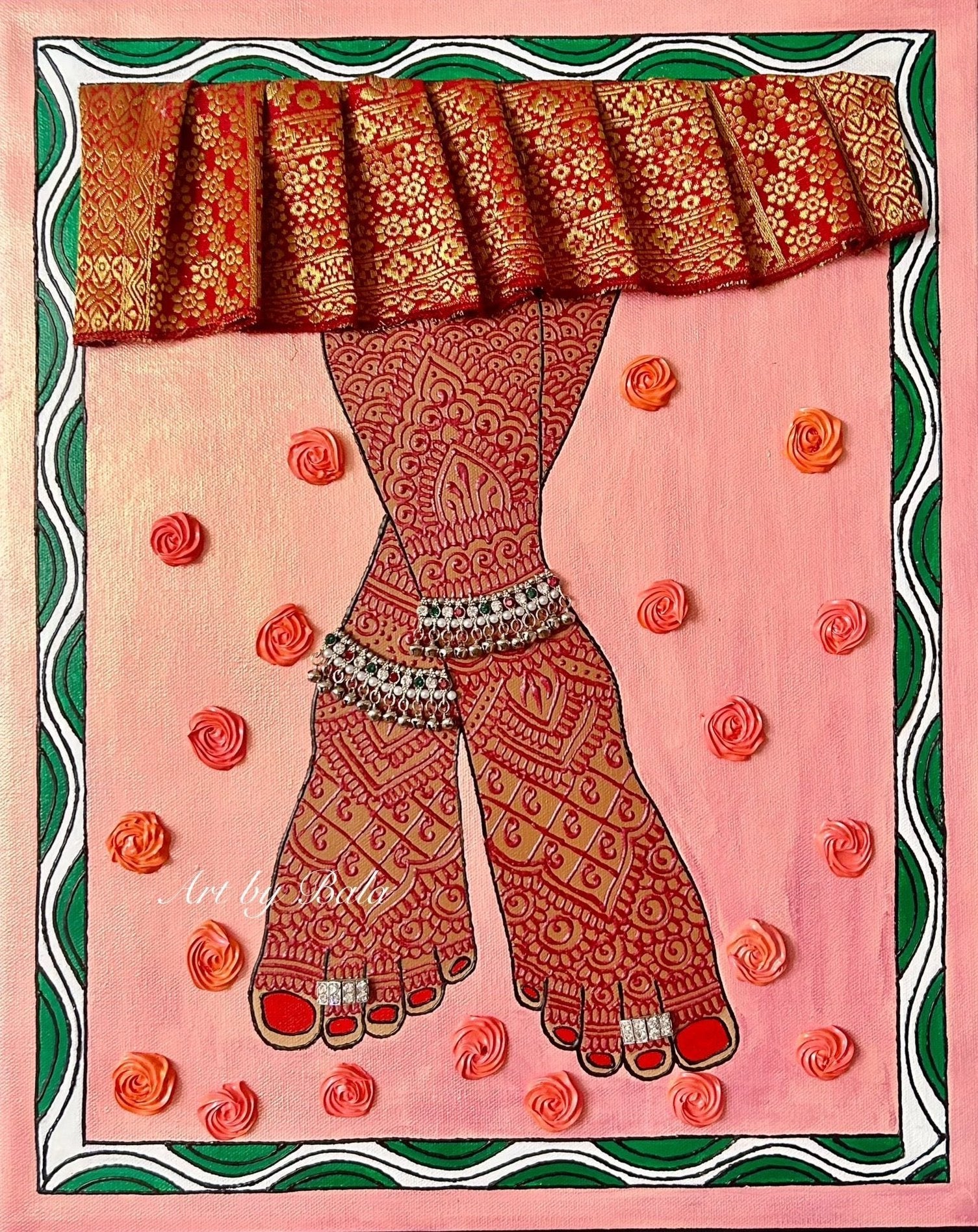 High Quality Photo print of Henna style textured acrylic portrait painting of an Indian bride'a feet - available on fine art paper and as a print on canvas.