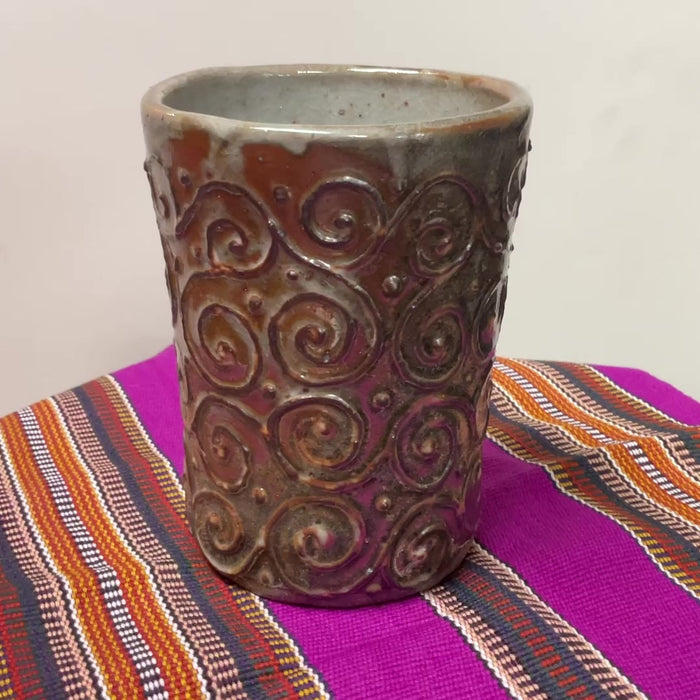 One of a kind, slab built, textured ceramic tumbler with a henna pattern. Holds ~16 oz.