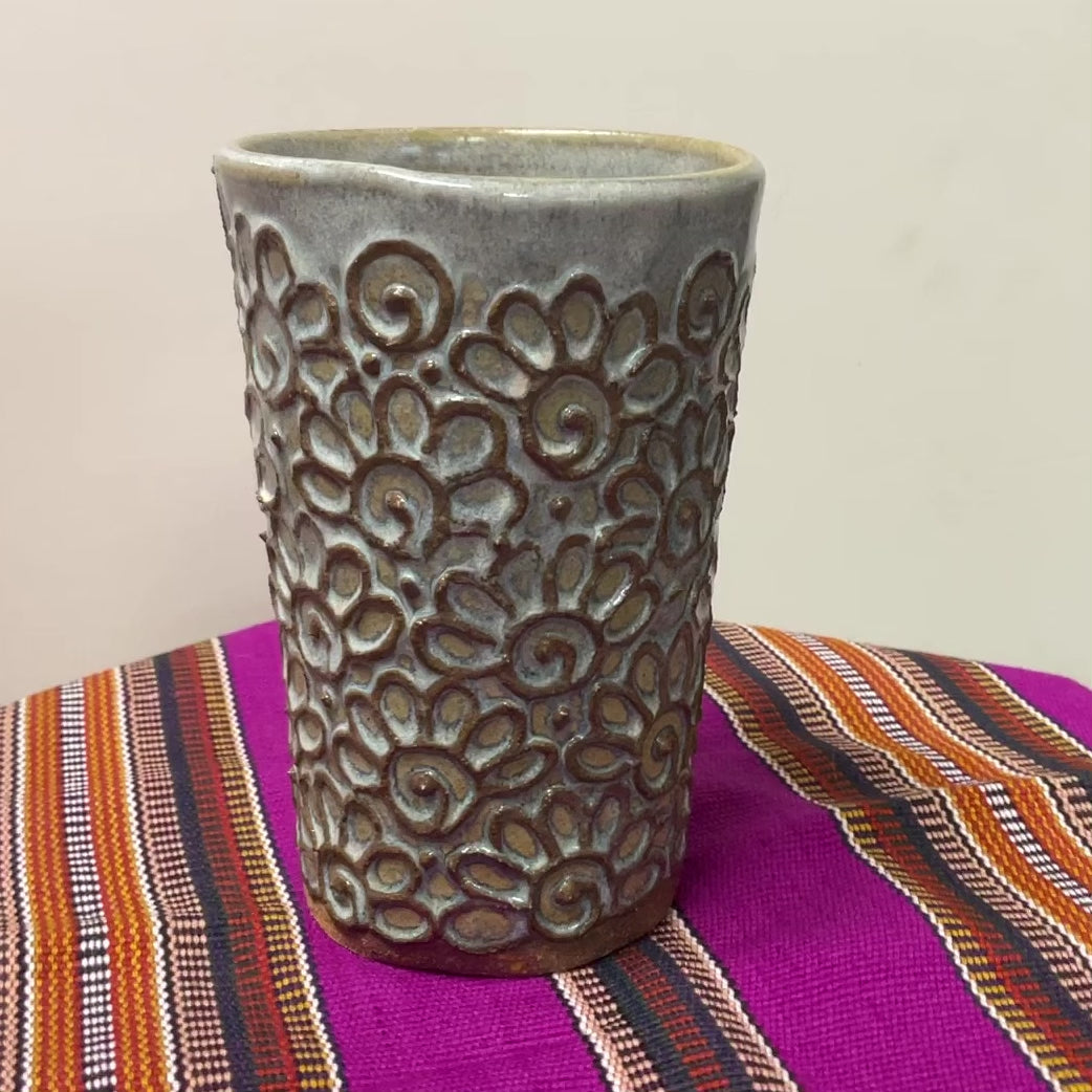 One of a kind, slab built, textured ceramic tumbler with a henna pattern. Holds ~16 oz.