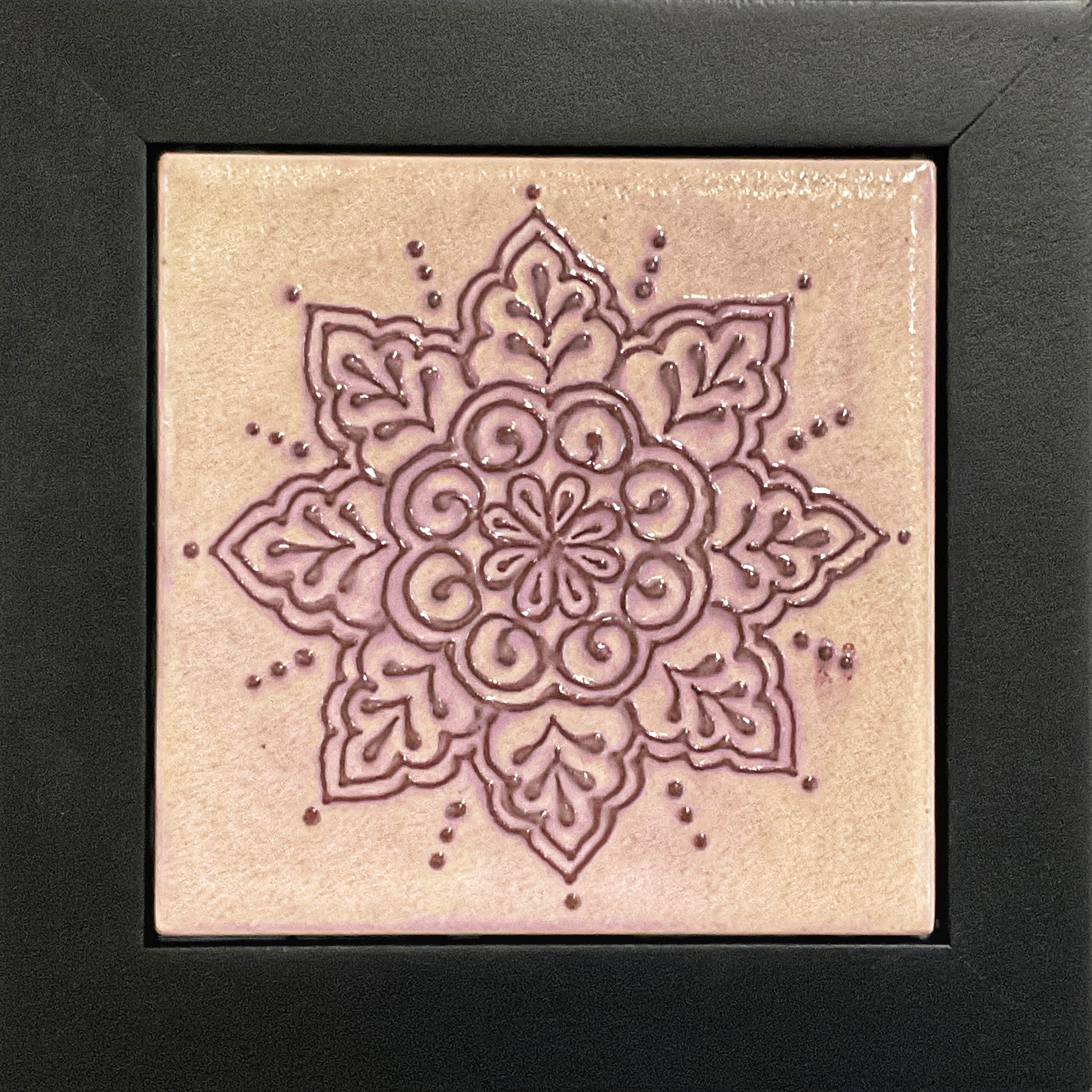 Slip-trailed textured mandala  on ceramic 4" x 4" tiles and framed to 6" x 6".  One of a kind wall art, done by piping colored slip on the tile and finished with a low fire glaze.